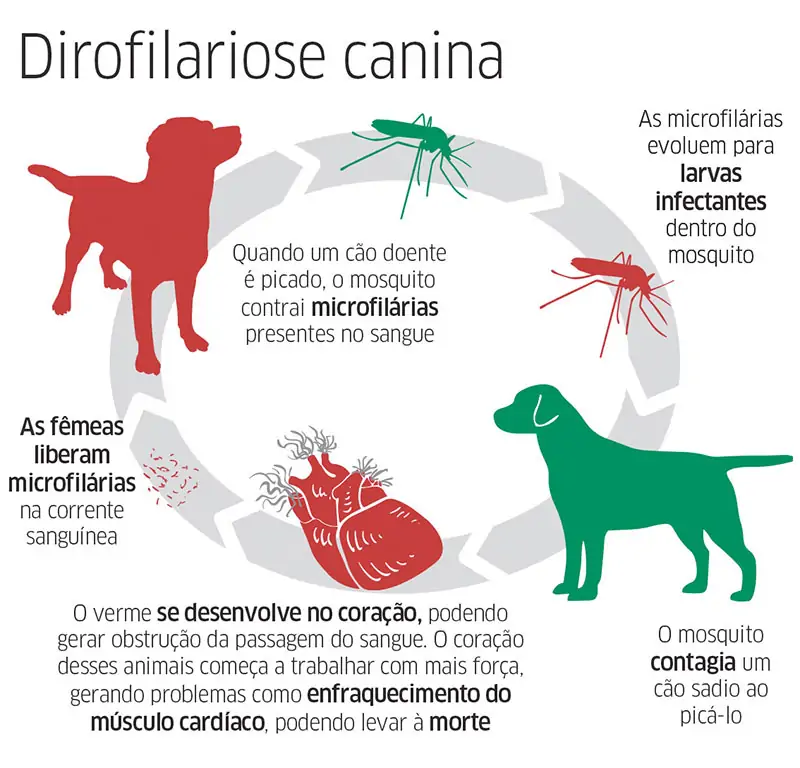 A dirofilariose, popularmente chamada de verme do coração, é causada pelo parasita Dirofilaria immitis. Ele se instala no coração, pulmões e vasos sanguíneos, comprometendo a saúde cardiovascular e podendo levar à morte. Mosquitos infectados são os vilões dessa história: ao picar um animal doente, eles carregam as larvas do parasita e as transmitem para pets saudáveis.